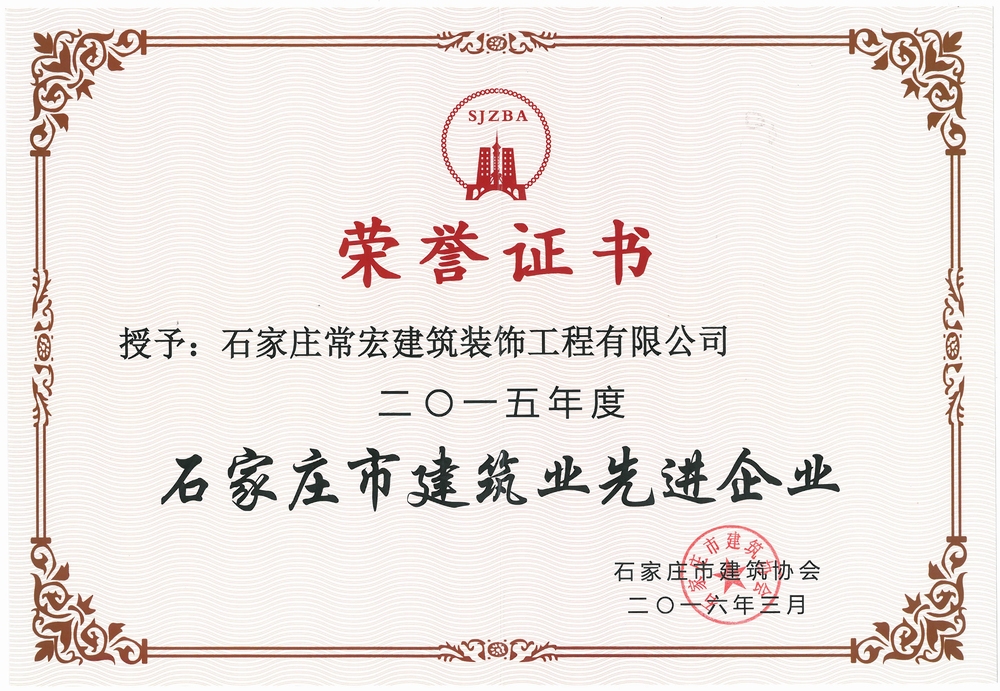 常宏建筑裝飾工程有限公司憑借夯實的專業(yè)技術(shù)、良好的信譽、完善的服務(wù),得到大眾及專家領(lǐng)導(dǎo)的信任及肯定,榮獲2015年度石家莊市建筑業(yè)先進企業(yè)以及2014-2015年度石家莊市建筑業(yè)誠信企業(yè)。